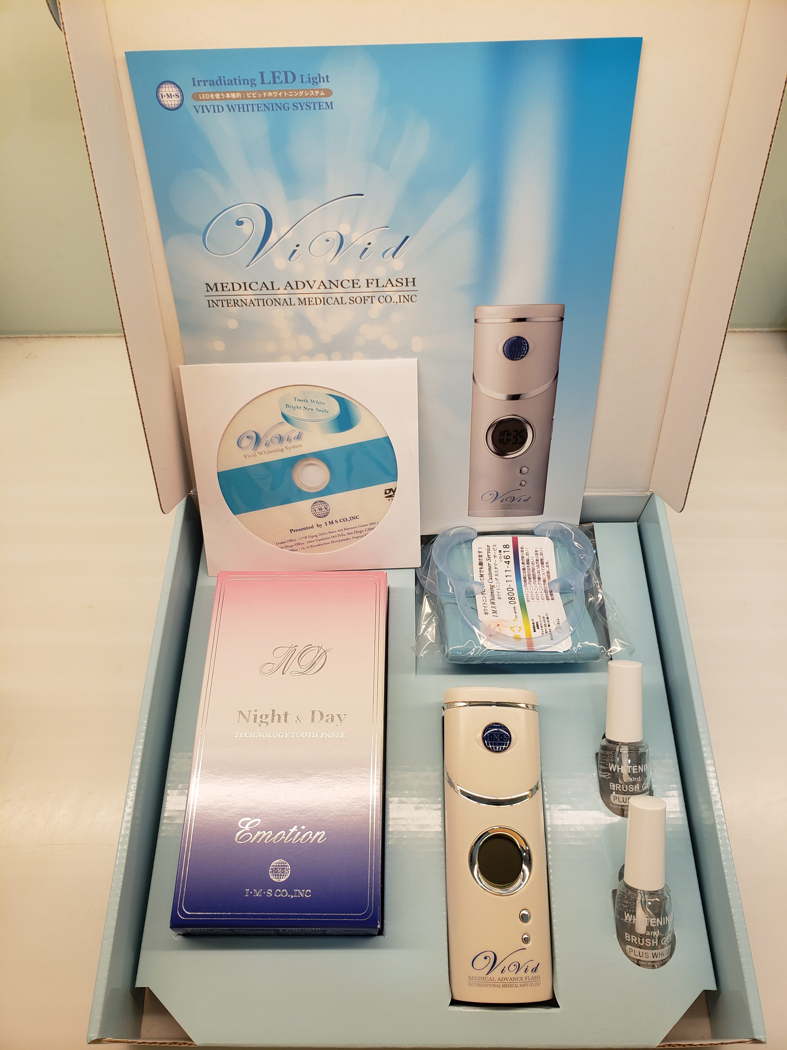 当院でオススメしているVividホワイトニングは過酸化水素ジ ェルを歯の表面に塗布しブルーLEDを照射して行います。PH7中性の為知覚過敏が起こりにくく、LEDは熱を発しない為 歯にダメージを与えません。