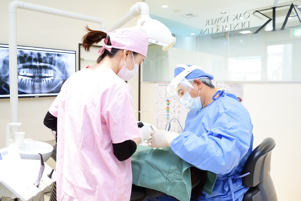 治療時に生じる痛みは、患者さんの心身の負担となってしまいますので、新宿・西新宿の歯医者「新宿オークタワー歯科クリニック」ではできる限り痛みを抑える工夫をしています。処置をする際は常に患者さんの状態を把握しつつ、豊富な経験や先端設備を活かして精密・繊細に治療することで、痛みを軽減させて歯ぐきからの出血も抑えます。