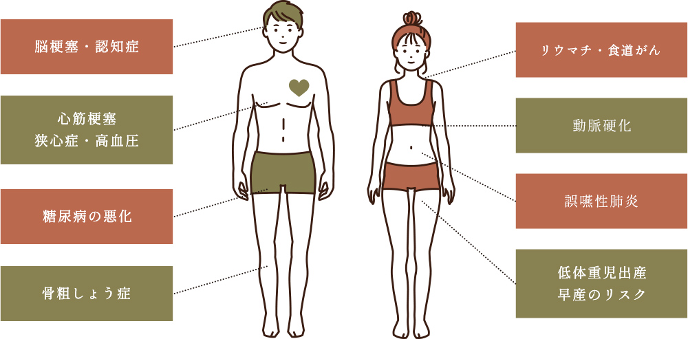 驚くべきことに歯周病菌やその病原菌が産生する毒素が、歯肉の血管を通じて体内を移動することにより、心臓病・肺疾患・血液疾患・早産などの全身疾患を引き起こすと言われており、歯周病のある人ほど血糖値が高く、生活習慣病の代名詞と呼ばれる糖尿病にも歯周病は関係しています。